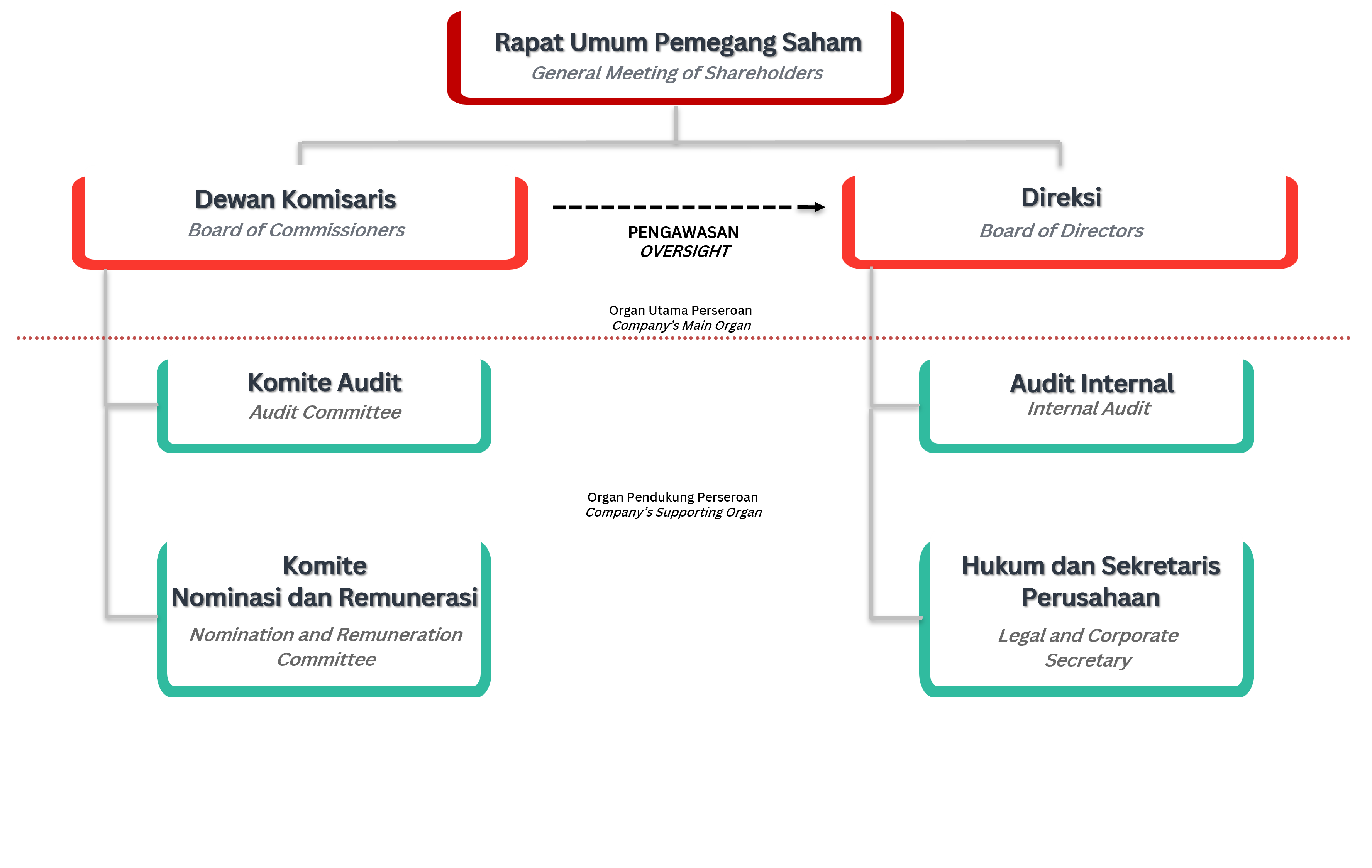 Struktur GCG Perseroan secara garis besar dibagi menjadi Organ Utama dan Organ Pendukung sebagai berikut: